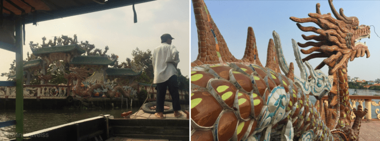 Anyway, the tour took us to a district far from the backpacker’s area. We were led through the backyard of a house (with chickens walking around) and arrived at a dock, where we boarded a small boat. After a short boat ride we arrived at Mieu Noi Phu Chau, a floating temple located in the middle of the river. We were the only tourists there! We enjoyed some coconut juice there while the guides answered all our questions. Then we went to a restaurant where the guides ordered a variety of local dishes for us to try.