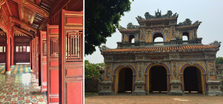 After a delicious breakfast (my father claims the ‘pho’ at our hotel was the best he ever tasted), we rented bikes and went to the imperial citadel. This is a huge complex right in the center of Hue, consisting of palaces, courtyards, gates and even a forbidden city. Strangely, it was very quiet here: we heard cigales and birds all around us. As this place was so beautiful and so large, we spent the morning and most of the afternoon here. We bought iced coffee and lunch (‘banh mi’) at a stall inside the complex, and enjoyed it in the shade whilst listening to the birds. This day is one of my favorite Vietnam memories 🙂