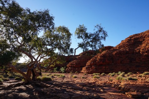 An early start again! It is recommended to start the Kings Canyon rim walk around sunrise, especially in summer since there is virtually no shade. The Kings Canyon rim walk starts with a large climb, consisting of around 1.000 ‘steps’ (or rather: stacked rocks). It was tough, but the view from the top is rewarding and afterwards there’s not much more climbing. The walk is around 6 kilometers and we loved every part of it. The rock structures are amazing. The rock domes that you can see during the walk are called ‘The Lost City’, since they look like an abandoned city. Also, there’s an area called ‘The Garden of Eden’, where you descend into the gorge to discover a very lush, green garden with a stream.