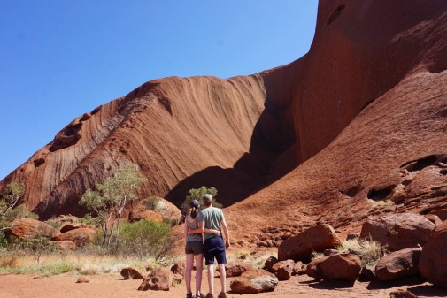 After sleeping a bit longer for once, we woke up slowly with breakfast and coffee. We then drove to Uluru to see the rock from up close. It is amazing and so different from what you would expect: it has a strange structure, with lots of ‘holes’ in it. We would have liked to do the Uluru ‘base walk’, which loops around the whole rock, but at 11:00 the temperature had already reached over 40 degrees Celsius. So instead we went to the Uluru visitor centre to learn more about Uluru and the aboriginal culture, and have lunch in the (airconditioned) restaurant. That evening, we watched the sunset from the campsite. Afterwards we fled to a bar at the resort for some drinks: the bush flies outside were driving us crazy and our camper was still very hot.