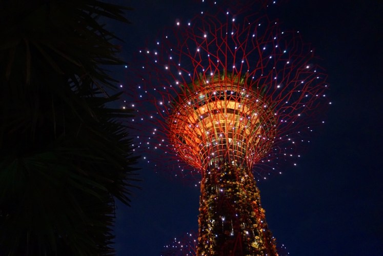 After sunset, we hurried towards Gardens by the Bay and arrived just in time for the Garden Rhapsody, a light- and sound show in the Supertree Grove. We were too late to get a seat, but lying on the ground looking up worked fine too! It only lasts for maybe 15 – 30 minutes, but is worth the effort to get there.